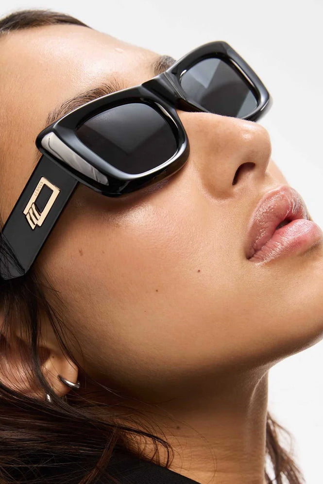 Finished in shiny black with bright gold hardware and dark tonal lenses for a sleek look.